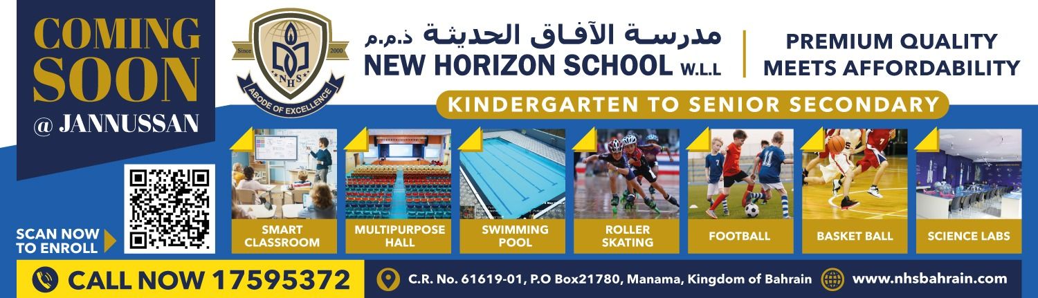 New Horizon School is a well-established private school in Bahrain that offers CBSE curriculum to students from preschool, Kindergarten to middle school (4 years to 15 years). The school's curriculum is designed to provide a structured and progressive framework for learning across a range of subjects with happiness content as one of the core values.